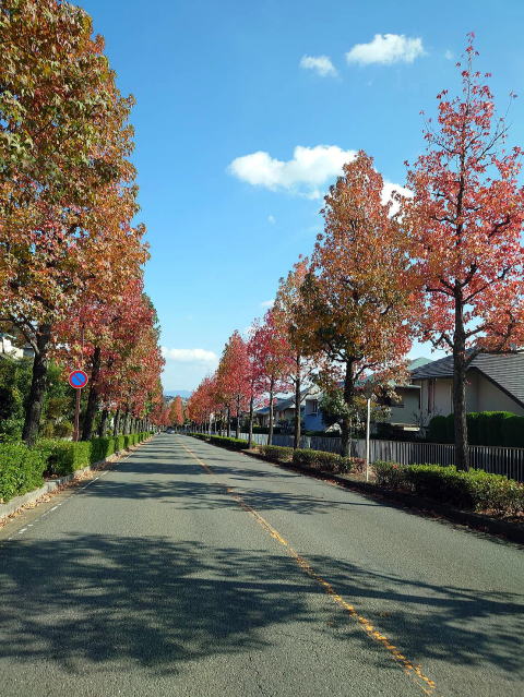 2025年11月16日(日) 西京区の洛西ニュータウンから国道9号線を挟んで北側に広がる、 桂坂(かつらざか)という住宅街。 桂坂ニュータウンの東西南北に通る、 外周道路沿いに約2kmに、約400本ものモミジバフウが植えられています。 |