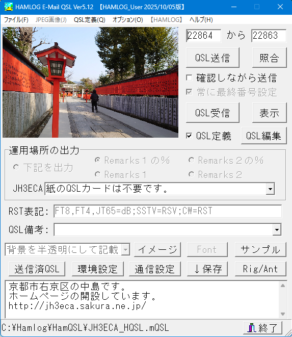 | 毎週 木曜日 | 20 時 ~ 21 時 | 7.110 MHz (LSB) | FT8 / bpsk_93.75 による画像通信 |