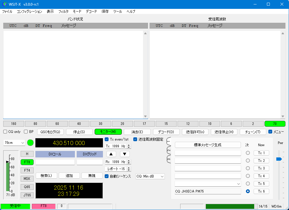 | 毎週 土曜日 | 20 時 ~ 21 時 | 430.510 MHz (USB) | FT8 / Q65_30Sec の微弱通信 |