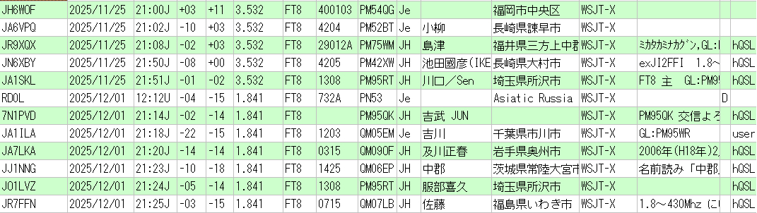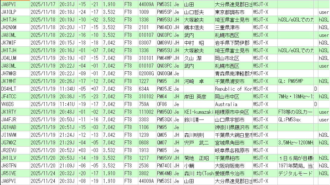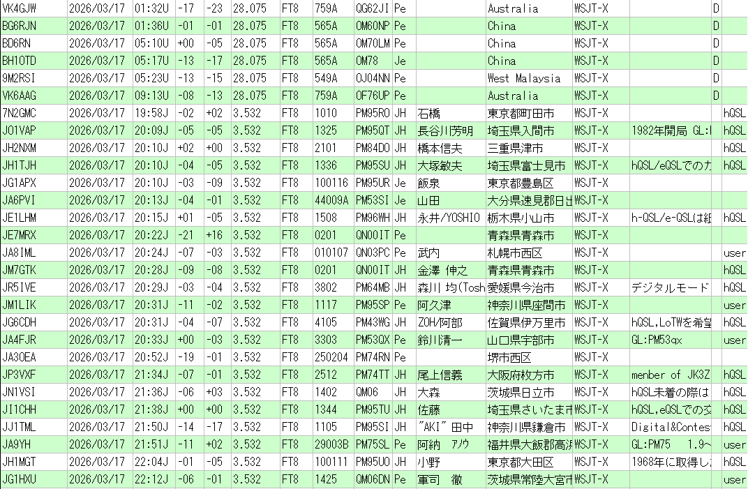 | 毎週 火曜日 | 20 時 ~ 21 時 | 3.531 MHz (USB) | FT8 / FT4 の微弱通信 |