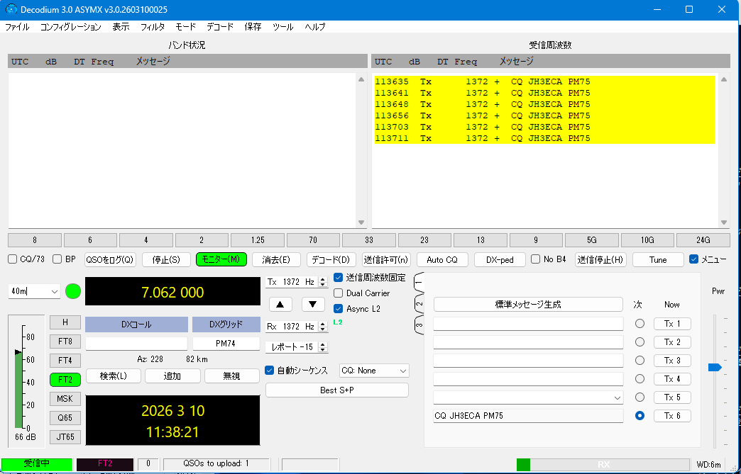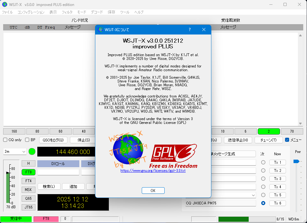 | 毎週 金曜日 | 20 時 ~ 21 時 | 144.460 MHz (USB) | FT8 / Q65A_30Sec の微弱通信 |