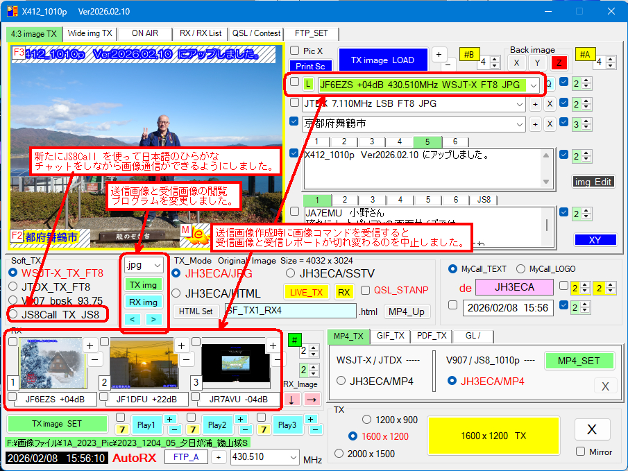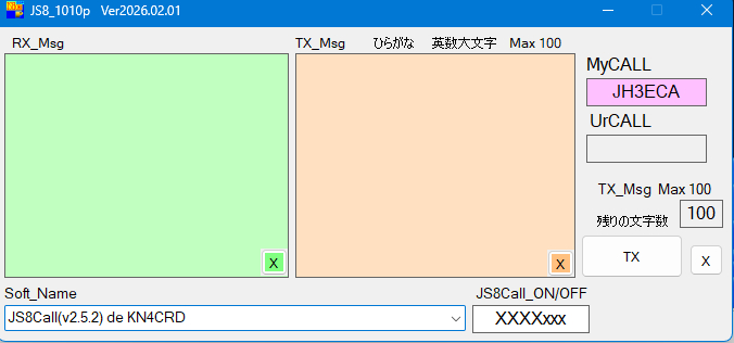 ● JS8Call +JS8_1010p+X412_1010p を使って日本語チャットと画像通信ができるソフトを制作中!!(現在テスト中) ● 「送信」 X412で画像を作ってJS8Call 用のチェット文章を書き込み「送信ボタン」でJS8_1010p~JS8Call にコマンドを転送 送信します。 ● 「受信」 JS8Call で送られて来たコマンドを受信、JS8_1010p に転送~X412の画像コマンドを転送して受信画像を表示します。 日本語チャットは「ひらがな」+「英数大文字」+1部の特殊文字のみが有効です。 私のパソコンを使って日本語チャット+画像コマンドを送信の様子(動画MP4) ・・・ 私のパソコンを使って日本語チャット+画像コマンドを受信の様子(動画MP4) ・・・ 受信の動画でJE3RNC 雛倉さんの画像が表示されますが実際にJE3RNC 雛倉さんが送信されたのでは無く実験としてコールをお借りしています。 JS8Call の送受信タイミングはFT8の15秒と区別するために10秒で送受信します。 |
