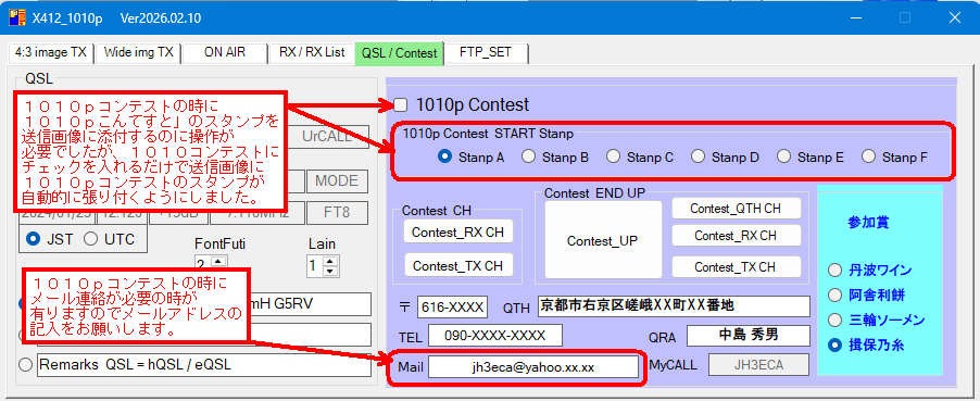 1.開催日時 2026年02月15日(日曜日) AM 07時00分 ~ PM 13時00分(JST) の6時間 2.参加資格 アマチュア局 3.交信指定周波数 1.909MHz / 3.531MHz / 7.041MHz / 50.303MHz / 144.460MHz / 430.510MHz / 1296.600MHz (USB)の周波数で WSJT-X / JTDX / MSHV のソフトを使った Mode FT8 の交信 (上記以外の周波数での交信は禁止) 私の周波数帯別運用周波数です。 可能な局は下記の時間と周波数での運用をお願いします。 1.909MHz 07時00分~07時15分 3.531MHz 07時15分~07時30分 7.041MHz 07時30分~12時00分 50.303MHz 12時00分~12時10分 144.460MHz 12時10分~12時20分 430.510MHz 12時20分~12時30分 1296.600MHz 12時30分~12時40分 7.041MHz 12時40分~13時00分 4.交信方法等 CQの呼び出しは必ず下記のような PXP を入れたCQでお願いします。 CQ PXP JH3ECA PM75 上記のCQ形式で呼んでもらえる局は全員交信OKです。 CQ PXP 形式でCQ後、連続して呼ばれる時は無条件で呼ばれる局とは連続交信してください。 ただし、呼ばれる局がいなくなり再度CQを出すときは必ず CQ PXP 形式で送信します。 CQ PXP の形式でCQを出す時の便利な方法として N201_1010p を使ったCQを出す方法を下記に紹介していますので見てください。 ![]() (b) 交信条件 CQ PXP と記載された CQ は1010pコンテストの参加局です。 WSJT-X / JTDX / MSHV のソフトを使った Mode FT8 による通常の交信 (c) 同じ局との交信は同一周波数では1回のみです。 (d)1交信を1点とします。25局交信の時は25点です。 5.交信の注意事項 ① CQは必ず CQ PXP JH3ECA PM75 のみ有効で通常のCQ JH3ECA PM75は認めません。 ② 交信は必ずPXPの付いた局のみの交信としてPXPの付いていない局との交信は認めません。 ③ CQ PXP のCQ後、呼んでいただける局は全部OKですので交信してください。 ただ、、呼ばれる局無くなり再度CQ出すときは必ず CQ PXP でCQを出してください。 6mの周波数は 50.303MHz です。(50.313MHzを使った交信は絶対禁止!!) 160mの周波数は 1.909MHz です。(1.840MHzを使った交信は絶対禁止!!) CQ PXP と表示されてる局との交信してください。 注意・・・指定周波数以外の交信は絶対禁止!! 6.交信上のお願い できる限り送信出力を控えめのQRPで送信お願いします。 最大出力は50Wまででお願いします。 できれば10W / 20Wでの交信を希望します。 7.書類の提出 (a) 交信ログを電子メール/LINEに添付で申請お願いします。 交信局数が確認出来て交信時間及び交信レポートが確認できれば交信ログファイルの形式はなんでもOKです。 *1番多くの局と交信している局に「優勝カップ」を送ります。 *参加賞として上位5名様に記念品として「丹波ワイン」or「阿闍梨餅」を贈りますので 郵便番号、住所、氏名、電話番号 を必ず添付してください。 以前は抽選でランダムに参加賞を送っていましたが、、、今回からは上位1位、2位、3位 の局に参加賞を送ります。 必ず「丹波ワイン」か「阿闍梨餅」か「三輪ソーメン」か「揖保乃糸」か? を記入お願いします。 郵便番号、住所、氏名、電話番号 の記載の無い場合、優勝カップも記念品も送れませんので次の候補の方に送りますので注意してください。 なお、送っていただいた個人情報は記念品を贈るためだけに使わせていただき発送終了時点で削除させてもらいます。 (b) 提出締切日 2025年02月20日(金) (c) 提出先 jh3eca@yahoo.co.jp 8.優勝カップ及び参加記念品 (a) 優勝者には「優勝カップ」と「丹波ワイン」か「阿舎利餅」か「三輪ソーメン」か「揖保乃糸」を送ります。 (b) 参加賞として上位、1位、2位、3位 の3名様に、京都の丹波のワイン「丹波ワイン」か「阿闍梨餅」か「三輪ソーメン」か「揖保乃糸」を送ります。 注意①・・コンテストログ申請時に必ず「丹波ワイン」か「阿舎利餅」か「三輪ソーメン」か「揖保乃糸」か、のどれか1品を明記して下さい。 注意②・・「阿舎利餅」は賞味期限が短いので早く食べていただく必要があります。 優勝カップをバージョンアップしました。。。ちょっと高い優勝カップです。 優勝局の注意事項 初めての優勝局には「優勝カップ+ペナント」を送りますので優勝カップの取っ手の所に「優勝ペナント」を結んでください。 同じ局が何度も優勝する可能性が有りますので、1度優勝した局には優勝カップは送りません。 2度目の優勝局には「優勝ペナント」を送りますので2枚3枚と優勝ペナントを増やして結んでください。 ![]() ![]() 参加賞の種類を増やしました。お酒の飲めない人もどんどん参加お願いします。 ![]() 丹波ワイン(赤or白) 阿舎利餅 三輪ソーメンの詰め合わせ 揖保乃糸ソーメン |