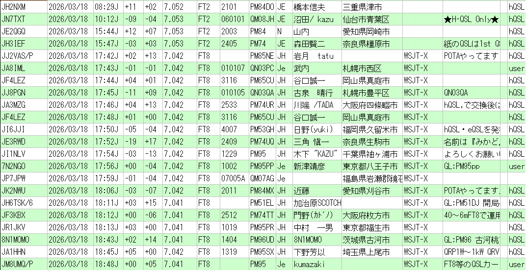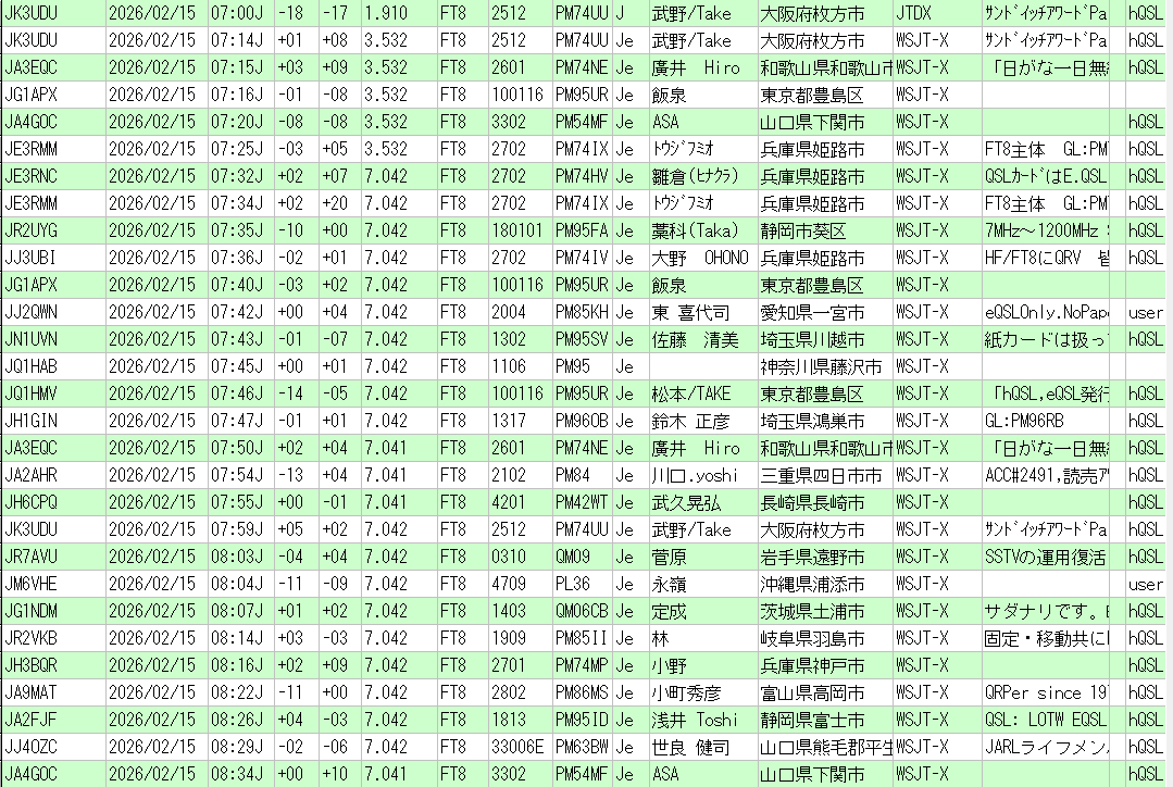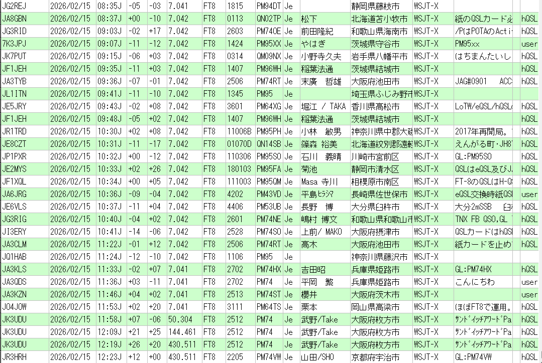 | *QSL枠の「JH」はhQSL 「Pe」はQ513にて電子QSL発行 eQSL登録局には全員に発行 |