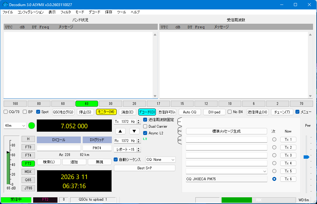 Decodium v3.0 ASYMX v3.0.2603100027 ・・・ とんでもないソフトが出てきました。。。 WSJT-X に FT2 スピード3.8秒。。。。。 Ver3.0.26100025 v3.0.2603090010から自動アップされるようになりました。 ⚡ 非同期TX — FT2がクロックから解放される DECODIUM 3.0コードネームRaptorは非同期送信を搭載しています。 FT2は復号後300ms以内に送信し、周期境界、NTP、DT補正なしです。 波形持続時間は2.47秒(標準比−34%)に最適化されています。 378行のレガシーDT/NTPコードが削除されました。 WSJT-X、JTDX、MSHV との完全後方互換性が維持されています。 PSK Reporter MAP ・・・ ここから見て下さい 必ず自己責任でお願いします。 ![]() |