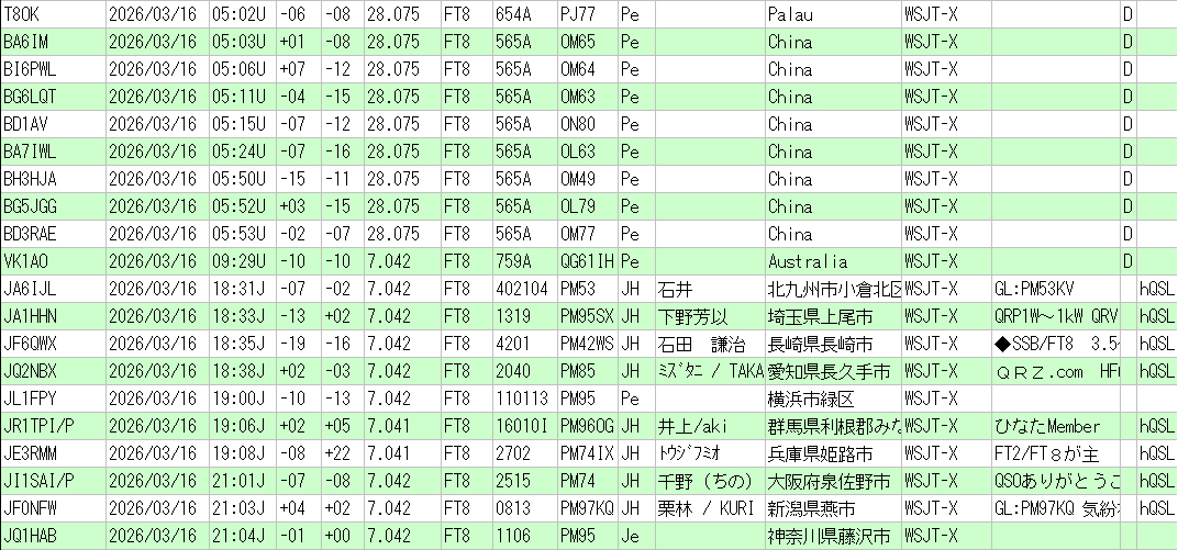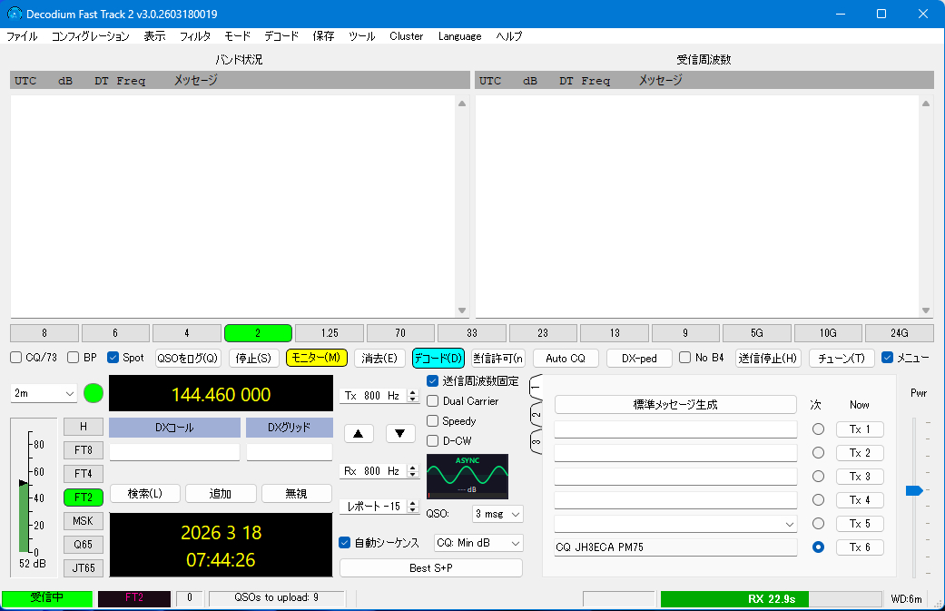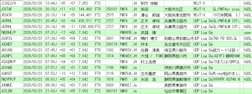 | 毎週 金曜日 | 20 時 ~ 21 時 | 144.460 MHz (USB) | FT8 / FT2 の微弱通信 |