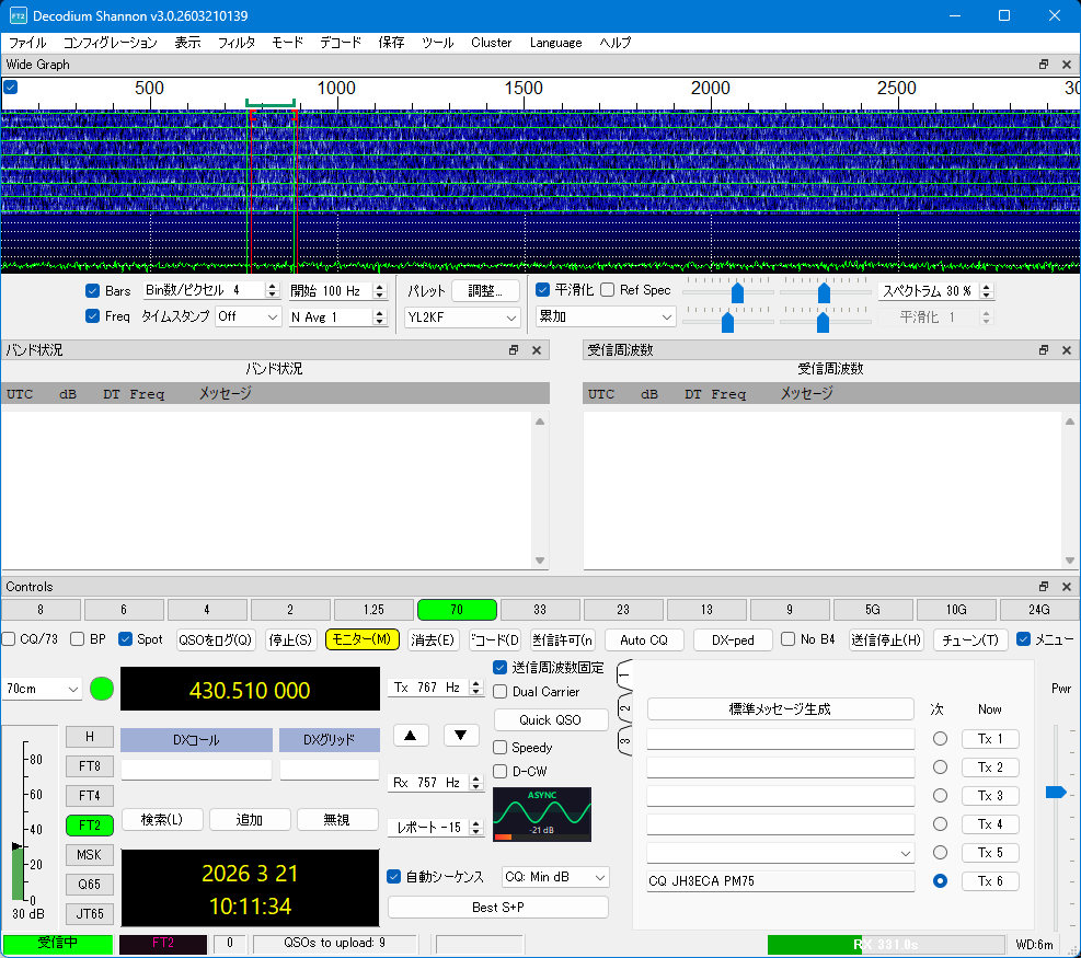 | 毎週 土曜日 | 20 時 ~ 21 時 | 430.510 MHz (USB) | FT8 / FT2 の微弱通信 |