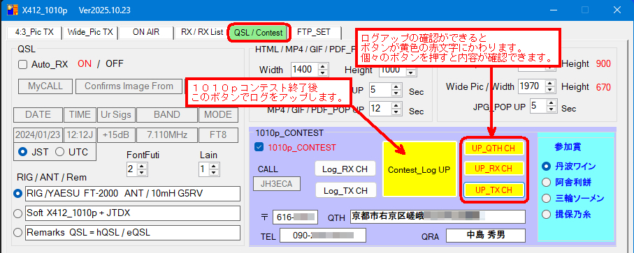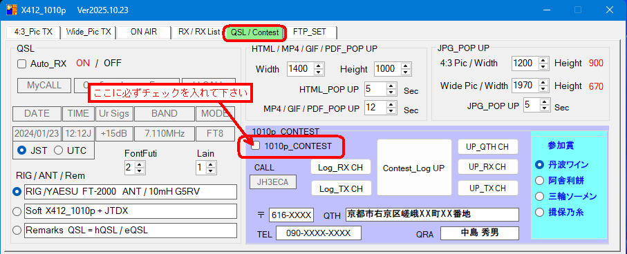 ![]() ● 1010pコンテストの参加はX412 / V907 のソフトは最新バージョンのソフトにインストールが必要です。 2025年09月05日現在の最新バージョンは X412_1010p Ver2025.09.05 V907_1010p Ver2025.09.05 1.開催日時 2026年01月18日(日) 09時00分 ~ 15時00分(JST) の6時間 2.参加資格 アマチュア無線局で画像通信に興味の有る局 画像転送用の個人サイトを持っていない局はX412の「FTP_xx1」「FTP_xx2」を使って画像通信をしてください。 3.画像通信指定周波数 7.110MHz LSB WSJT-X / JTDX のソフトを使った FT8 による画像通信 V907_1010p を使ったPSK による画像通信 (上記以外の周波数での交信は禁止) 4.画像通信の方法 必ず下記の ① ② を使って 1010pコンテストに参加してください。 X412_1010pの古いバージョンにはこの1010pコンテストの機能が搭載されていませんので 1010pコンテスト参加には必ず最新バージョンのX412_1010p を使ってください。 ① X412_1010p の「1010p_CONTEST」に必ずチェックを入れてください。 コンテスト期間中の受信/送信のログの詳細を確認したい時は下記のチェックボタンで確認できます。 確認は何度してもOKですが、、、txtファイルの修正は絶対しないでください。(修正されたログファイルは失格です) 注意・・「1010p_CONTEST」のチェックを外すとコンテストの情報が全部消えますのでチェックを外すときは要注意です。 ![]() ② 送信画像の中に必ず X412_1010p の PlayBox の中の「1010pコンテスト」のロゴを貼り付けてください。 ![]() ![]() 上記の「1010pコンテスト」のロゴが送信画像に添付されていない画像は無効です。 画像通信に関しては通常の画像通信方法とします。 指定周波数でSSB局の混信の無い時はSSB(音声)による交信をしながら1010pコンテストに参加を希望します。します。 (b) 交信条件 「1010pコンテスト」と送信画像にロゴが添付されてる局と、どんどん交信してください。 5.画像通信の注意事項 ● 自分の送信した画像を自分で受信した画像は無効です。 ● 送信だけ、受信だけは無効です、必ず送信も受信もして下さい。 ● V907を使ってbpskの送信/受信のポイントは2倍になります。 6.画像通信のお願い できる限り違う画像の送信をお願いします。 できる限り交信形式の画像交換をお願いします。 混信が無く、可能でしたら音声(SSB)での交信もお願いします。 7.書類の提出 (a) コンテスト交信ログはX412から送信して提出します。 メールにコンテストログ添付してメール送信は不要です。 1010pコンテストログ提出後自分の交信ログを確認することができます。 ![]() *1番多くの送信と受信をした局に「優勝カップ」を送ります。 *参加賞として上位3局に記念品として「丹波ワイン」か「阿舎利餅」を贈りますので 郵便番号、住所、氏名、電話番号 を必ず添付してください。 郵便番号、住所、氏名、電話番号 の記載の無い場合、優勝カップも記念品も送れませんので次の候補の方に送りますので注意してください。 なお、送っていただいた個人情報は記念品を贈るためだけに使わせていただき発送終了時点で削除させてもらいます。 (b) 提出締切日 2026年01月13日(火) 注意・・・ 1010pコンテストログをメール送信後、必ず自分で1010pコンテストログの確認をします。 8.優勝カップ及び参加記念品 (a) 1番多く、画像を送信+受信をした局に「優勝カップ」を送ります。 (b) 参加賞として上位、1位、2位、3位 の3局に 京都の丹波のワイン「丹波ワイン」か京都の銘菓「阿闍梨餅」か奈良の「三輪ソーメン」か兵庫県の「揖保乃糸ソーメン」を送ります。 お酒の飲めない局は「阿舎利餅」か「三輪ソーメン」「揖保乃糸ソーメン」 希望とお酒の好きな局は「丹波ワインを希望と明記してください。 ただ、阿闍梨餅は賞味期限が短いので注意してください。 (c)優勝者には「優勝カップ」と「丹波ワイン」か「阿闍梨餅」か「三輪ソーメン」か「揖保乃糸ソーメン」を送ります。 優勝カップの写真はサンプルですので同じ優勝カップが届くかはわかりませんのでご理解お願いします。 優勝カップをバージョンアップしました。。。ちょっと高い優勝カップにしました。 1年に4回の 1月 / 5月 / 9月 の年4回の開催予定です。 優勝局の注意事項 初めての優勝局には「優勝カップ+ペナント」を送りますので優勝カップの取っ手の所に「優勝ペナント」を結んでください。 同じ局が何度も優勝する可能性が有りますので、1度優勝した局には優勝カップは送りません。 2度目の優勝局には「優勝ペナント」を送りますので2枚3枚と優勝ペナントを増やして結んでください。 ![]() ![]() 参加賞の種類を増やしました。お酒の飲めない人もどんどん参加お願いします。 ![]() ![]() ![]() ![]() 丹波ワイン(赤or白) 阿舎利餅 三輪ソーメン SH-B 揖保乃糸ソーメン |
