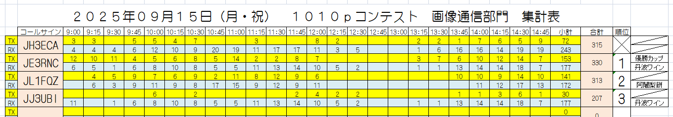 ![]() ● 1010pコンテストの参加はX412 / V907 のソフトは最新バージョンのソフトにインストールが必要です。 2025年12月06日現在の最新バージョンは X412_1010p Ver2025.12.12 V907_1010p Ver2025.09.05 です。 X412のバージョン Ver2025.11.03 のバージョンでもコンテスト参加は可能ですが、 できる限り最新バージョンでの参加をお願いします。 1.開催日時 2026年01月18日(日) 09時00分 ~ 15時00分(JST) の6時間 2.参加資格 アマチュア無線局で画像通信に興味の有る局 画像転送用の個人サイトを持っていない局はX412の「FTP_xx1」「FTP_xx2」を使って画像通信をしてください。 3.画像通信指定周波数 7.110MHz LSB WSJT-X / JTDX のソフトを使った FT8 による画像通信 V907_1010p を使ったPSK による画像通信 (上記以外の周波数での交信は禁止) 4.画像通信の方法 必ず下記の ① ② を使って 1010pコンテストに参加してください。 X412_1010pの古いバージョンにはこの1010pコンテストの機能が搭載されていませんので 1010pコンテスト参加には必ず最新バージョンのX412_1010p を使ってください。 ① X412_1010p の「1010p_CONTEST」に必ずチェックを入れてください。 コンテスト期間中の受信/送信のログの詳細を確認したい時は下記のチェックボタンで確認できます。 確認は何度してもOKですが、、、txtファイルの修正は絶対しないでください。(修正されたログファイルは失格です) 注意・・「1010p_CONTEST」のチェックを外すとコンテストの情報が全部消えますのでチェックを外すときは要注意です。 ![]() ② 送信画像の中に必ず X412_1010p の PlayBox の中の「1010pコンテスト」のロゴを貼り付けてください。 ![]() ![]() 上記の「1010pコンテスト」のロゴが送信画像に添付されていない画像は無効です。 画像通信に関しては通常の画像通信方法とします。 指定周波数でSSB局の混信の無い時はSSB(音声)による交信をしながら1010pコンテストに参加を希望します。します。 (b) 交信条件 「1010pコンテスト」と送信画像にロゴが添付されてる局と、どんどん交信してください。 5.画像通信の注意事項 ● 自分の送信した画像を自分で受信した画像は無効です。 ● 送信だけ、受信だけは無効です、必ず送信も受信もして下さい。 ● V907を使ってbpskの送信/受信のポイントは2倍になります。 6.画像通信のお願い できる限り違う画像の送信をお願いします。 できる限り交信形式の画像交換をお願いします。 混信が無く、可能でしたら音声(SSB)での交信もお願いします。 7.書類の提出 (a) コンテスト交信ログはX412から送信して提出します。 メールにコンテストログ添付してメール送信は不要です。 1010pコンテストログ提出後自分の交信ログを確認することができます。 ![]() *1番多くの送信と受信をした局に「優勝カップ」を送ります。 *参加賞として上位3局に記念品として 京都の丹波のワイン「丹波ワイン」か京都の銘菓「阿闍梨餅」か奈良の「三輪ソーメン」か兵庫県の「揖保乃糸ソーメン」を送りますので 郵便番号、住所、氏名、電話番号 を必ず記入してログアップのボタンを押してください。 郵便番号、住所、氏名、電話番号 の記載の無い場合、優勝カップも記念品も送れませんので次の候補の方に送りますので注意してください。 なお、送っていただいた個人情報は記念品を贈るためだけに使わせていただき発送終了時点で削除させてもらいます。 (b) 提出締切日 2026年01月21日(水) 注意・・・ 1010pコンテストログをメール送信後、必ず自分で1010pコンテストログの確認をします。 8.優勝カップ及び参加記念品 (a) 1番多く、画像を送信+受信をした局に「優勝カップ」を送ります。 (b) 参加賞として上位、1位、2位、3位 の3局に 京都の丹波のワイン「丹波ワイン」か京都の銘菓「阿闍梨餅」か奈良の「三輪ソーメン」か兵庫県の「揖保乃糸ソーメン」を送ります。 お酒の飲めない局は「阿舎利餅」か「三輪ソーメン」「揖保乃糸ソーメン」 希望とお酒の好きな局は「丹波ワインを希望と明記してください。 ただ、阿闍梨餅は賞味期限が短いので注意してください。 (c)優勝者には「優勝カップ」と「丹波ワイン」か「阿闍梨餅」か「三輪ソーメン」か「揖保乃糸ソーメン」を送ります。 優勝カップの写真はサンプルですので同じ優勝カップが届くかはわかりませんのでご理解お願いします。 1年に4回の 1月 / 5月 / 9月 の年4回の開催予定です。 優勝局の注意事項 初めての優勝局には「優勝カップ+ペナント」を送りますので優勝カップの取っ手の所に「優勝ペナント」を結んでください。 同じ局が何度も優勝する可能性が有りますので、1度優勝した局には優勝カップは送りません。 2度目の優勝局には「優勝ペナント」を送りますので2枚3枚と優勝ペナントを増やして結んでください。 ![]() ![]() 参加賞の種類を増やしました。お酒の飲めない人もどんどん参加お願いします。 ![]() 丹波ワイン(赤or白) 阿舎利餅 三輪ソーメン SH-B 揖保乃糸ソーメン |