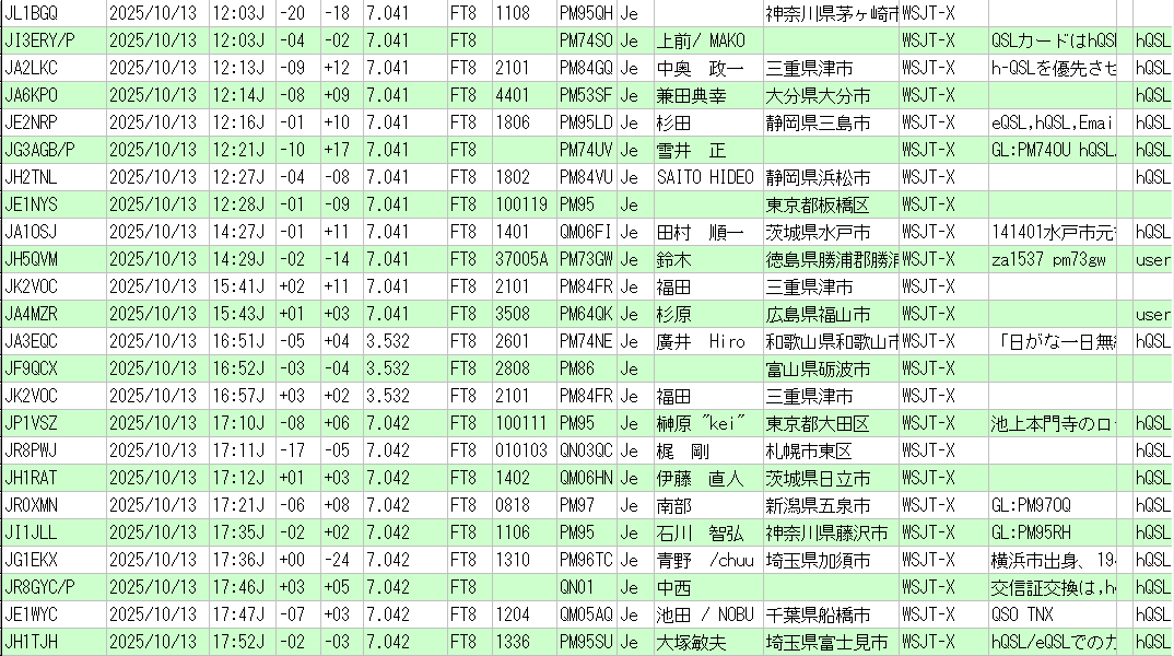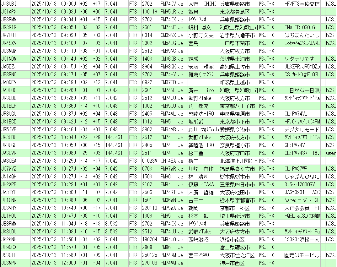 2025年10月14日(月) 2025年1013日(月・祝) 1010pコンテスト FT8交信部門の交信リスト |