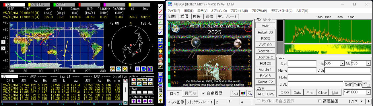 2025年10月04日(土) ISSからSSTVの画像が送信されています。 145.800MHZのFMで、MMSSTVのソフトを起動して受信できます。 私のアンテナは144MHzGPで受信しています。 ISS の SSTV の情報は ・・・ ISS の SSTV の情報は ・・・ |