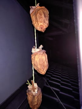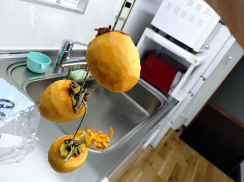| 滋賀県の道の駅で「しぶ柿」を発見 | 干し柿用に皮をむいて | himo ひもにつるして準備OK |