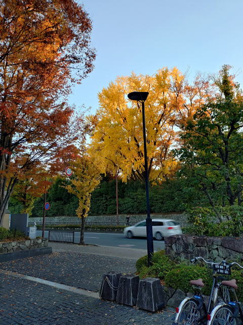 2025年11月16日(日) 西京区の洛西ニュータウンから国道9号線を挟んで北側に広がる、 桂坂(かつらざか)という住宅街。 桂坂ニュータウンの東西南北に通る、 外周道路沿いに約2kmに、約400本ものモミジバフウが植えられています。 |