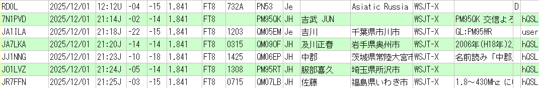 2025年12月02日(火) 毎週、月曜日は1.909MHzのFT8のスケジュール交信日 T2FDアンテナからG5RVアンテナに変更してから1.9MHz/1.8MHzには電波を出すことができませんでした。 で、、G5RVアンテナを改造して1.9MHz/1.8MHzにも出れるようにしてみました。 で、、月曜日のスケジュールに合わせて1.909MHzにでてみますが、、、まったく信号が聞こえません? ためもとで1.840MHzを覗いてみたら1.909MHzとは違って多くの信号が見えていました。 海外の局も出ています。。。ダメもとでコールすると1発コールで交信成立、1.9MHzと全然違います? また多くにJA局からも呼ばれて多くの交信ができました。 |