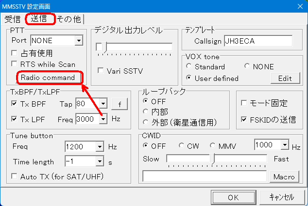 @ MMSSTV の「オプション」〜「MMSSTVの設定画面」を選択 A 出てきた窓の「送信」タブを選択 B 「Radio command」のボタンをクリック |