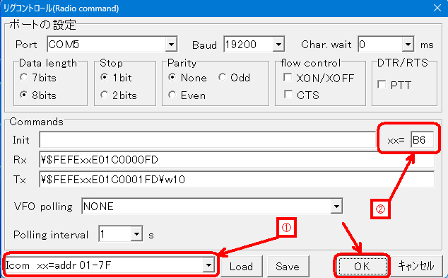 ● リグコントロール の画面ができます。 @ 説明画面「1」から 「Icom xx=addr 01-7F」を選択 A 説明画面「2」の xx= の中に「B6」と記入 B Port番号は私の場合は「COM5」になっていますが、、ここは個々のCOMポート番号です。 C Band「19200」にセット後説明画面のようにセットでOKです。 D 「OK」でセット終了です。 参考@・・・SAVEボタンで名前を付けて保存することでログコントロール設定を保存できます。 適当な名前(例 ICOM_IC7300MK2)付けって保存しておくと便利です。 参考A・・xx=の枠の中に下記の番号を入れる事でICOMの無線をコントールできます。 A2 = IC9700 70 = IC-7000 94 = IC-7300 |