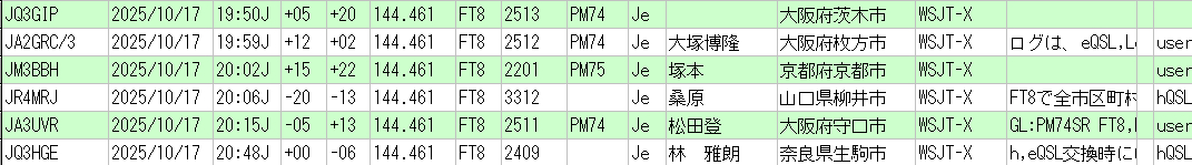 毎週 金曜日 | 20 時 ~ 21 時 | 144.460 MHz (USB) | FT8 / JT65 の微弱通信 |